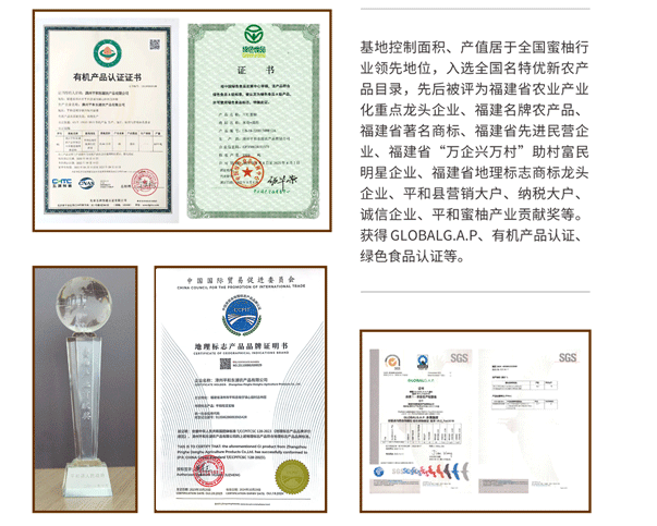 - 基地控制面积、产值居于全国蜜柚行业领先地位,入选全国名特优新农产品目录,先后被评为福建省农业产业化重点龙头企业、福建名牌农产品、福建省著名商标、福建省先进民营企业、福建省“万企兴万村”助村富民明星企业、福建省地理标志商标龙头企业、平和县营销大户、纳税大户、诚信企业、平和蜜柚产业贡献奖等。获得GLOBALGAP、有机产品认证绿色食品认证等。